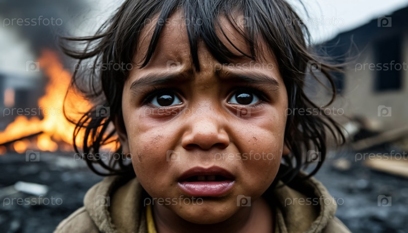 Лицо испуганного темного ребенка на фоне огня крупным планом. Сгенерированный ИИ
