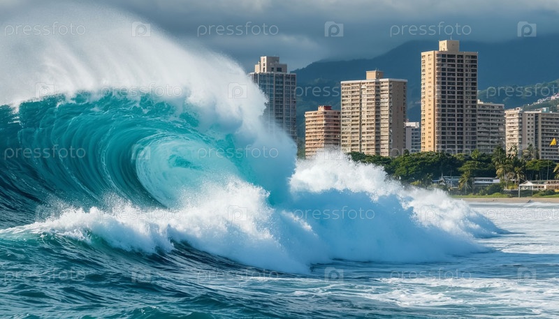 Большая морская волна возле городского побережья. Сгенерированный ИИ