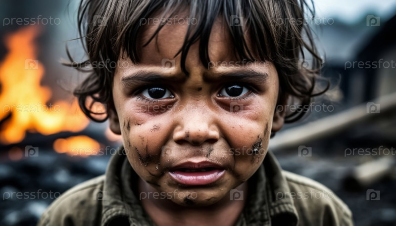 Лицо испуганного темного ребенка на фоне огня крупным планом. Сгенерированный ИИ