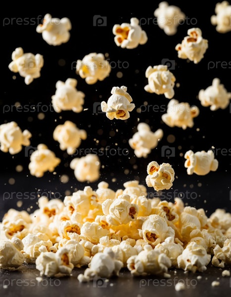 Попкорн в воздухе на черном фоне. Сгенерированный ИИ
