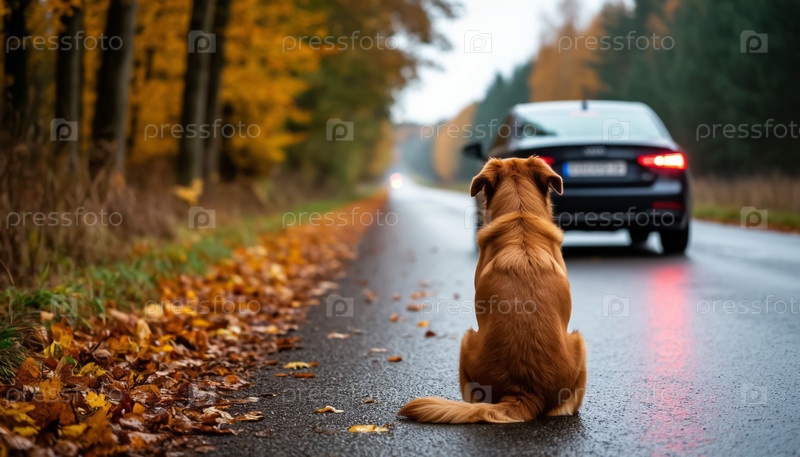 Собака на обочине дороги с грустью смотрит на машину, когда ее владелец уезжает. Создан компанией Ai