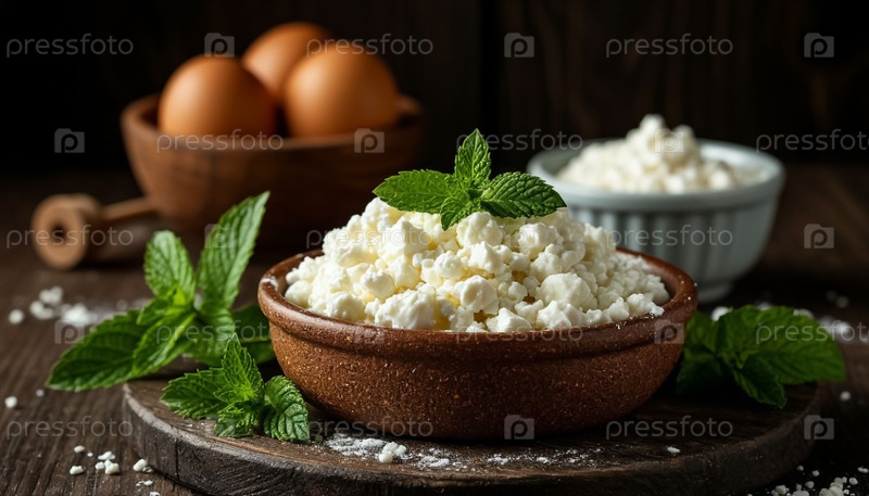 Коттеджный сыр на деревянном столе - натуральная фермерская продукция. Создан компанией Ai