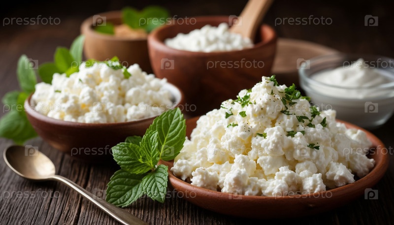 Коттеджный сыр на деревянном столе - натуральная фермерская продукция. Создан компанией Ai