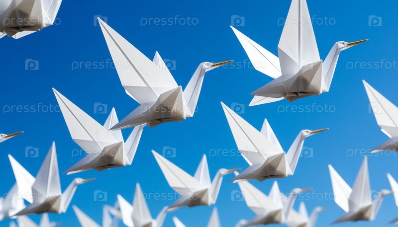 Бумажные журавли на фоне голубого неба. Создан ии