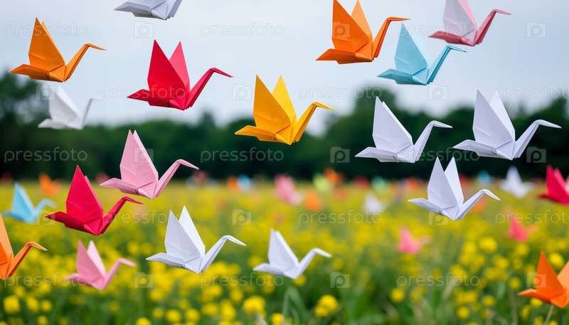 Красочные бумажные журавли над полем
