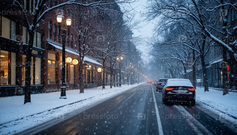 Зимний городской пейзаж вечером. Создан компанией Ai