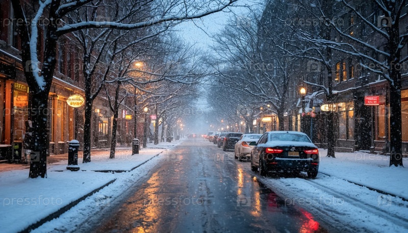 Зимний городской пейзаж вечером. Создан компанией Ai