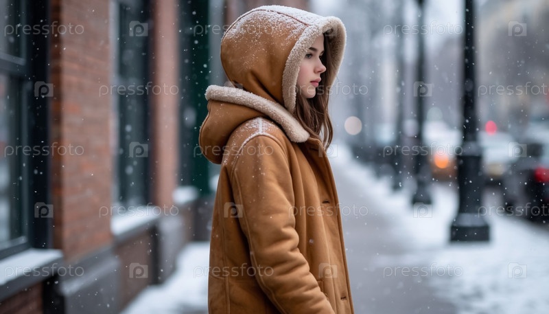Девушка в овечьей шкуре в городе во время снегопада. Сгенерированный ИИ
