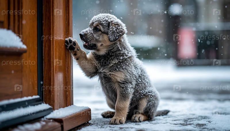 Щенок у двери и первый снег в городе. Генерируется ИИ