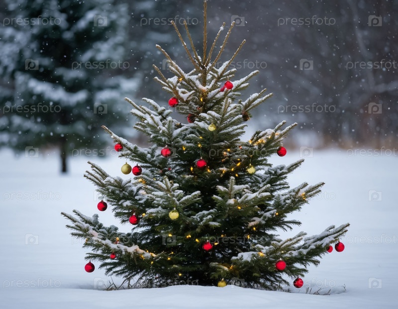 Елка украшена рождественскими игрушками на природе в лесу. Создан компанией Ai