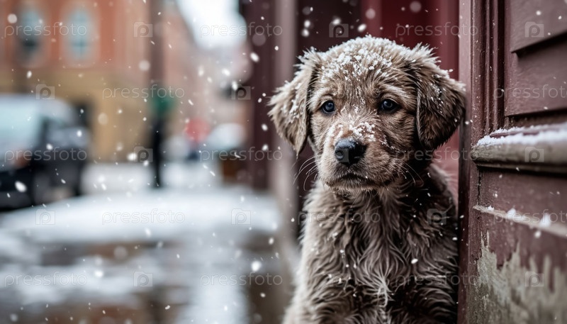 Щенок у двери и первый снег в городе. Генерируется ИИ
