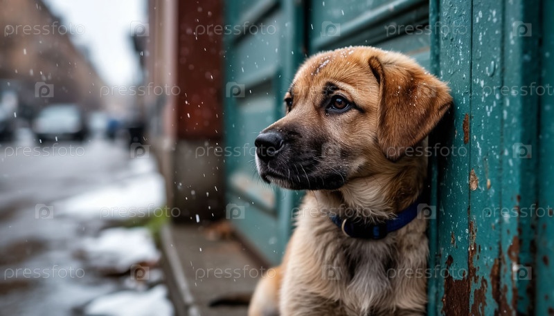Щенок у двери и первый снег в городе. Генерируется ИИ