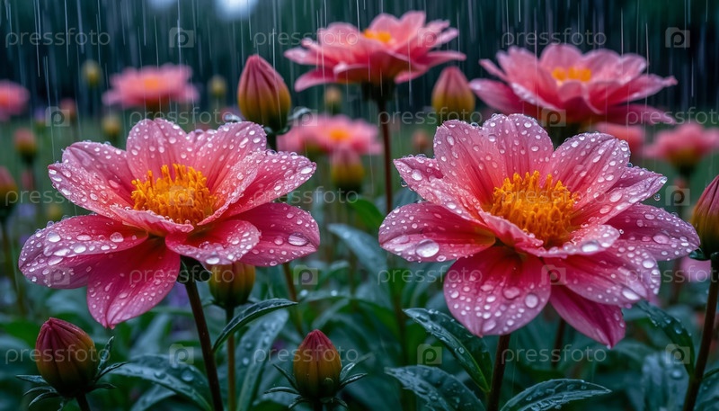 Цветы под дождем, 3D-рендеринг. Генерируется ИИ