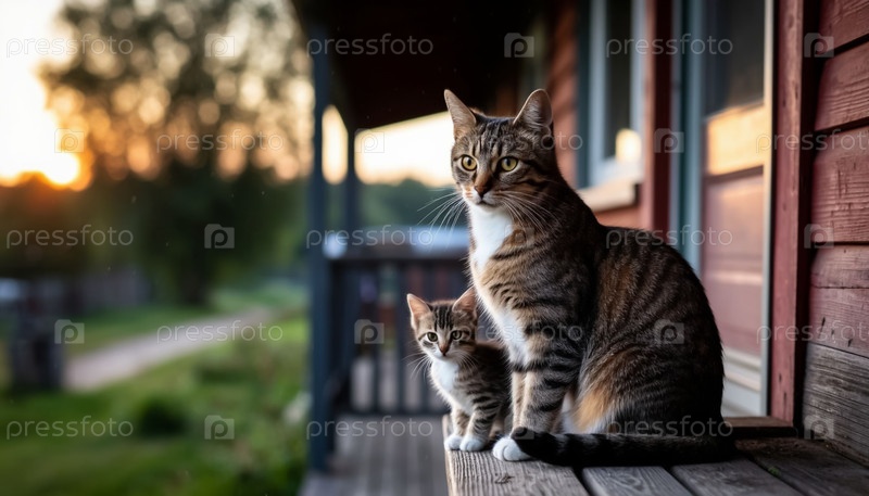 Кошка, сидящая со своим котенком на крыльце деревенского дома. Сгенерированный ИИ