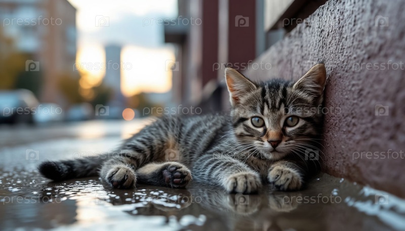 Бездомный котенок промок под дождем и лежит возле стены дома в городе. Генерируется ИИ