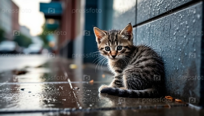 Бездомный котенок промок под дождем в городе. Генерируется ИИ