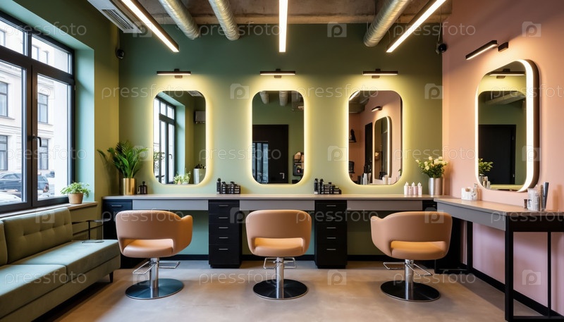 Интерьер салона красоты в пастельных тонах фисташки. Генерируется ИИ
