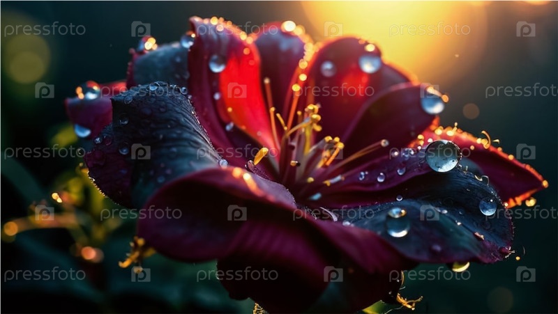 Волшебный бордовый цветок с каплями росы, макрос, 3D-искусство