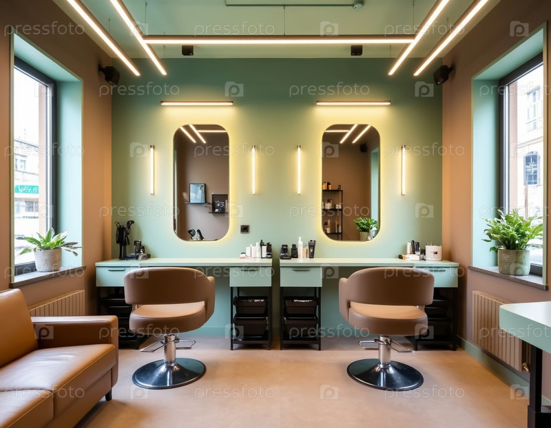 Салон волос в пастельных тонах фисташки. Сгенерированный ИИ
