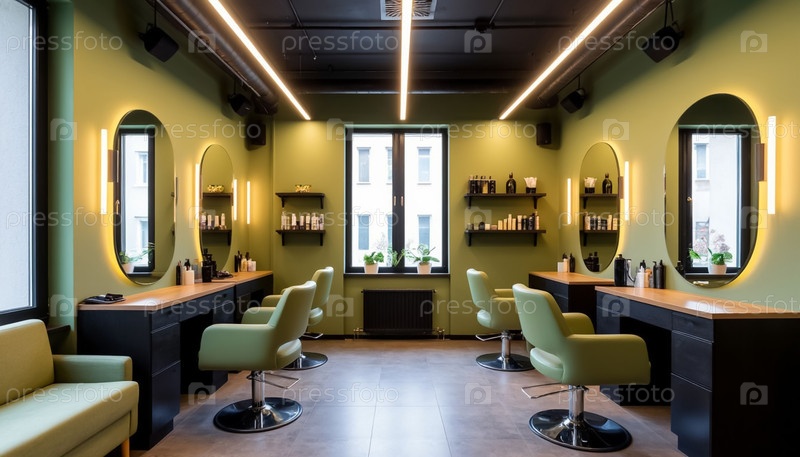 Интерьер салона красоты в пастельных тонах фисташки. Генерируется ИИ