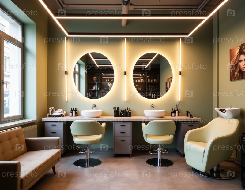 Интерьер салона красоты в пастельных тонах фисташки. Генерируется ИИ