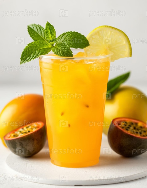 Желтый лимонад с манго и страстными фруктами в стакане. Генерируется ИИ