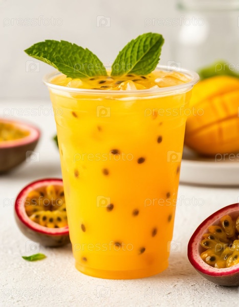 Желтый лимонад с манго и страстными фруктами в стакане. Генерируется ИИ