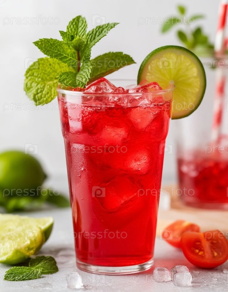 Лимонад красно-оранжевый в стакане на белом фоне. Сгенерированный ИИ