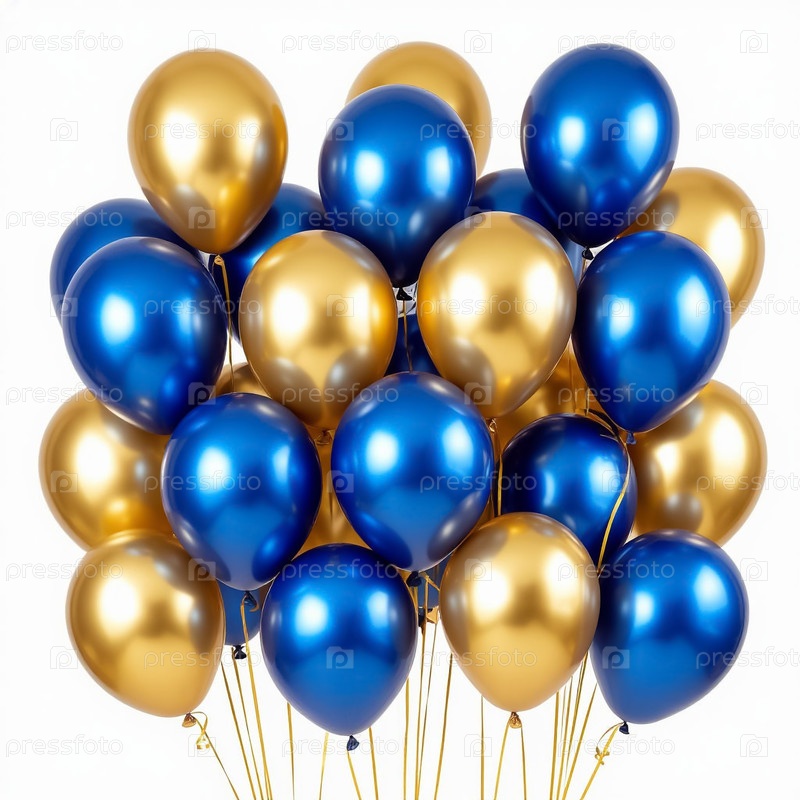 Воздушные шары синие и золотые на белом фоне. Генерируется ИИ
