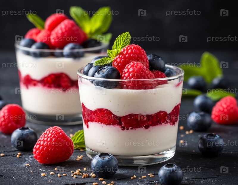 Десерт с ягодами на темном фоне. Генерируется ИИ