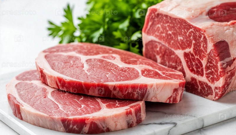 Мраморное мясо на белом столе, иллюстрация, созданная ИИ