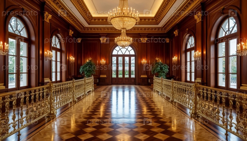 Интерьер зала в роскошном особняке - паркет, дерево, золото в интерьере. Генерируется ИИ