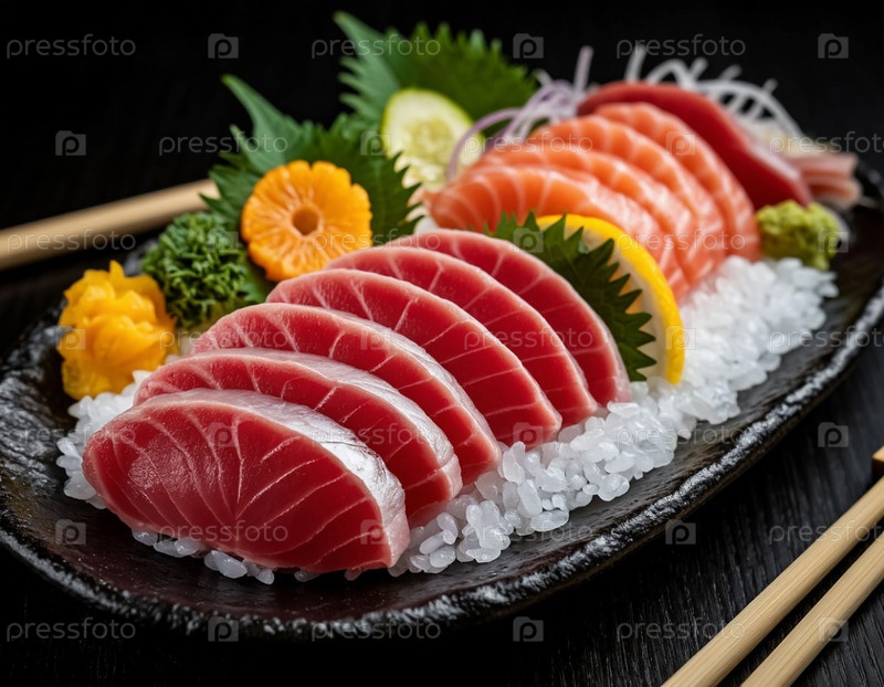 Японская еда, сырая рыба с соевым соусом - сашими. Сгенерированный ИИ