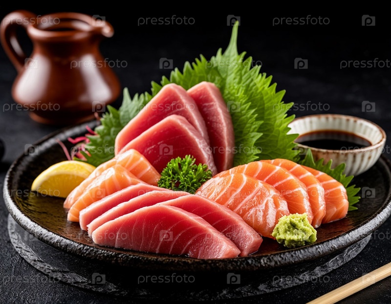 Японская еда, сырая рыба с соевым соусом - сашими. Сгенерированный ИИ