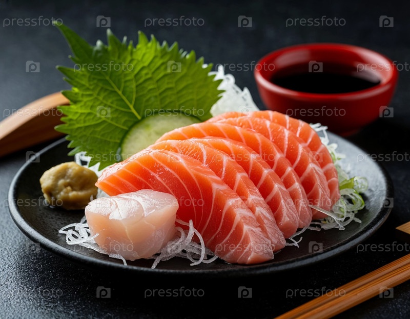 Японская еда, сырая рыба с соевым соусом - сашими. Сгенерированный ИИ