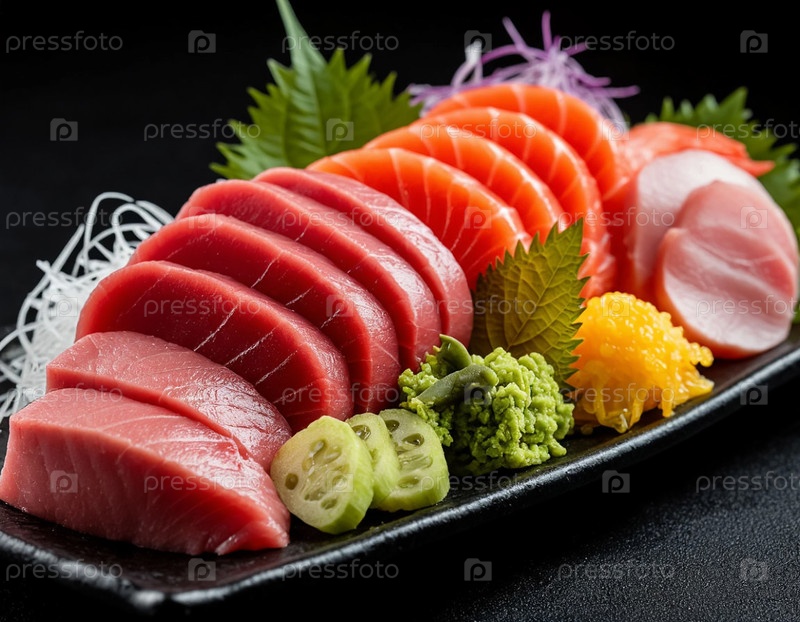 Японская еда, сырая рыба с соевым соусом - сашими. Сгенерированный ИИ