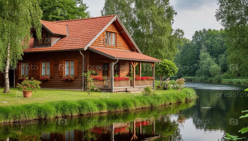 Деревянный загородный дом на берегу реки, недалеко от леса. Сгенерированный ИИ