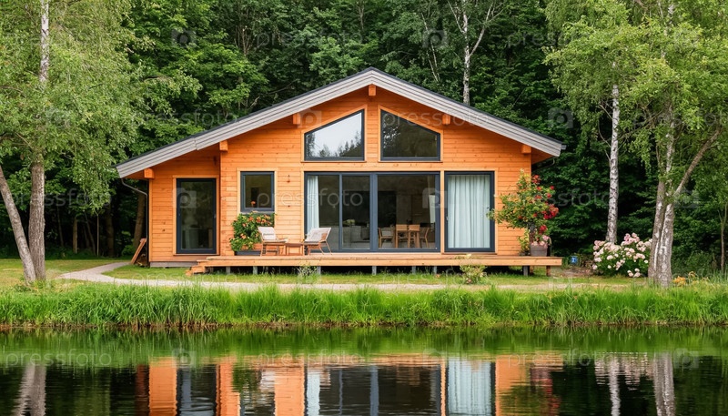 Современный деревянный загородный коттедж в лесу у реки. Загородный отдых. Генерируется ИИ