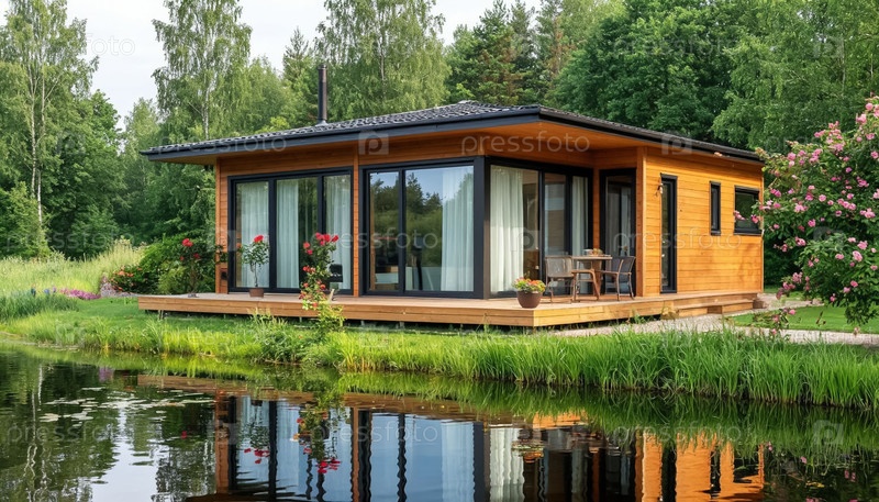 Современный деревянный загородный коттедж в лесу у реки. Загородный отдых. Генерируется ИИ