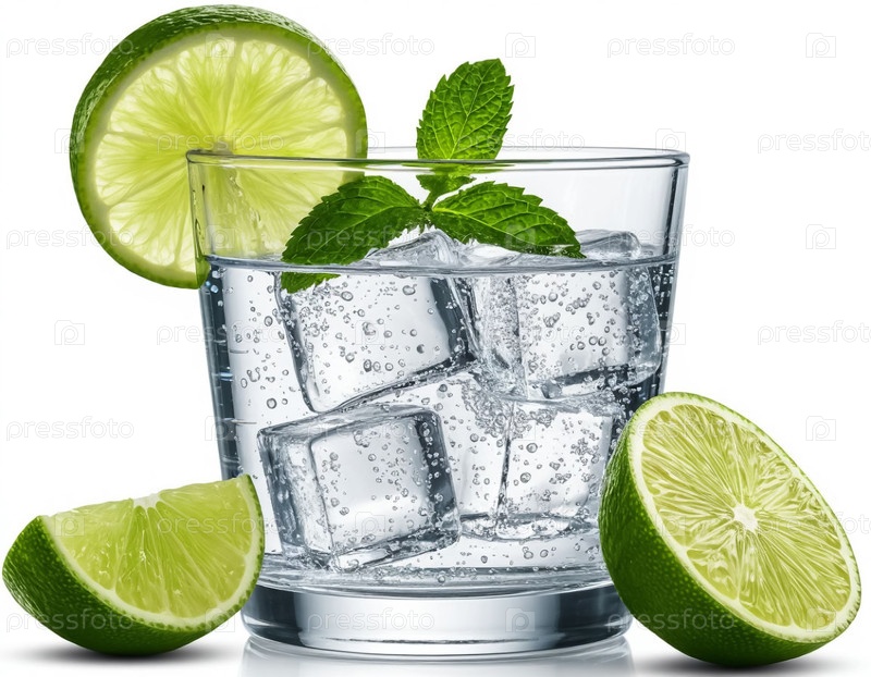 Водка со льдом в стакане и известью на белом фоне. Сгенерированный ИИ