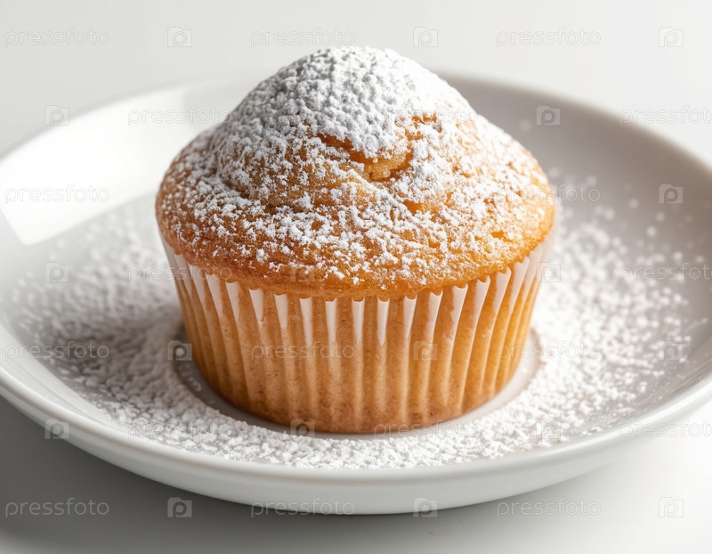 Маффин с сахарной пудрой на тарелке на белом фоне. Сгенерированный ИИ