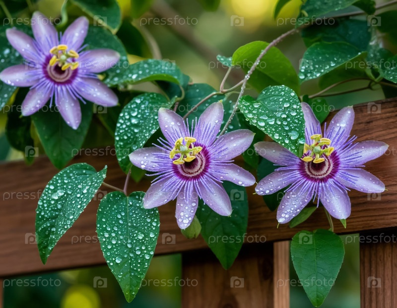 Пассифлора поднимается на цветок на заборе. Сгенерированный ИИ