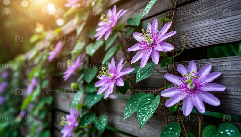 Пассифлора поднимается на цветок на заборе. Сгенерированный ИИ
