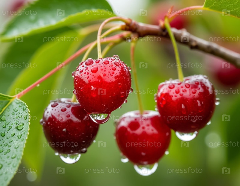 Спелая вишневая ягода на ветке в саду крупным планом. Генерируется ИИ