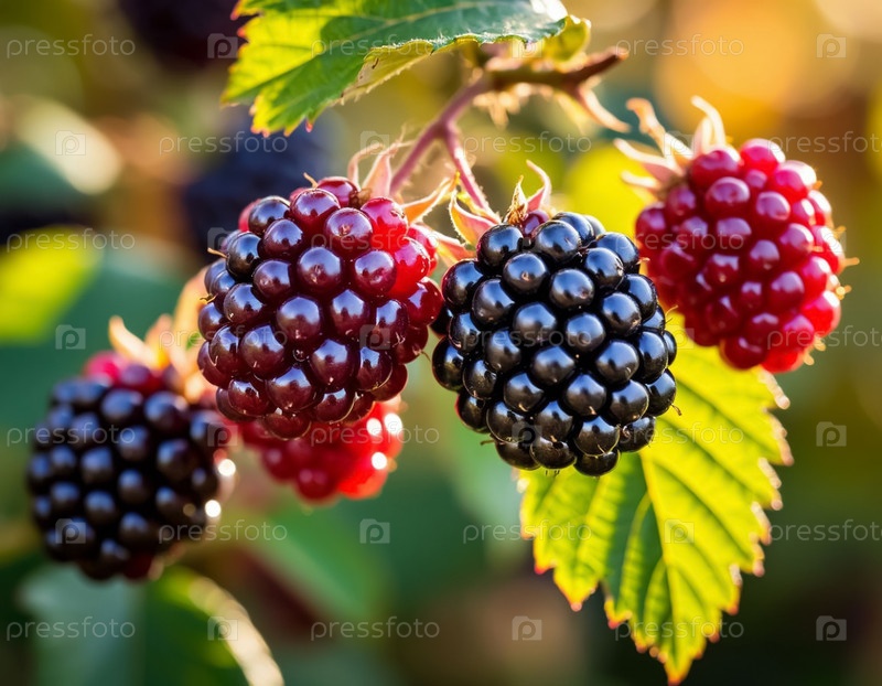 Спелая ежевика крупным планом в саду. Генерируется ИИ