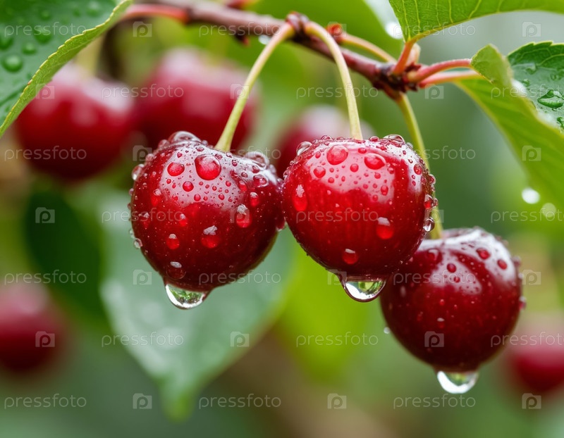 Спелая вишневая ягода на ветке в саду крупным планом. Генерируется ИИ