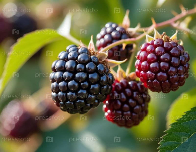 Спелая ежевика крупным планом в саду. Генерируется ИИ