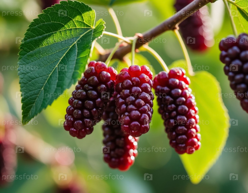 Ягода Малберри на ветке крупным планом в саду. Сгенерированный ИИ
