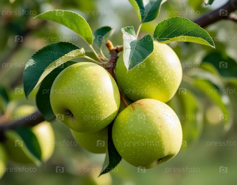 Зеленые яблоки на ветке в саду. Сгенерированный ИИ