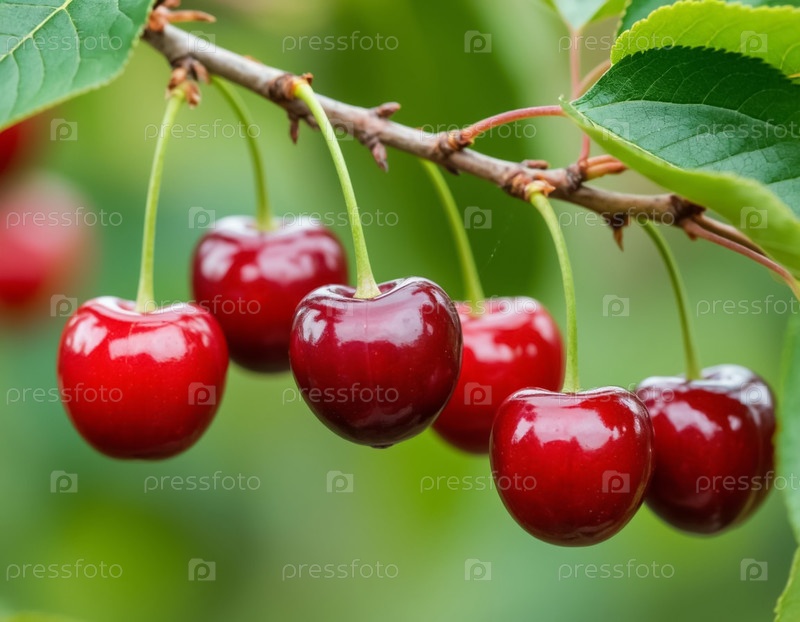 Спелая вишневая ягода на ветке в саду крупным планом. Генерируется ИИ